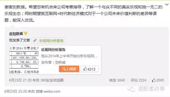 劉姝威昨晚21:20的報告發布后,我覺得反應最快的就是樂視了。昨晚23:20,即《樂視網報告》發布兩小時后,樂視網投資者關系微博發表回應劉姝威:“謝謝劉教授。希望您有機會來公司考察指導,了解一個與眾不同的真實樂視和獨一無二的樂視生態;同時期望就互聯網+時代新經濟模式對于一個公司未來價值判斷的差異等課題,能深入交流。”
